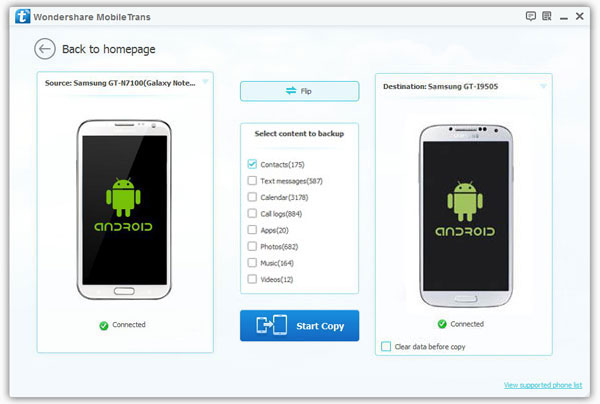 Then connect your two devices to your computer via USB cables. Please note that iPhone device should be set as the source phone while your new Galaxy Note 7 is displayed as the destination phone inside right. If you reverse them, you can click the “Flip” button upper the contents list to change the position of them.